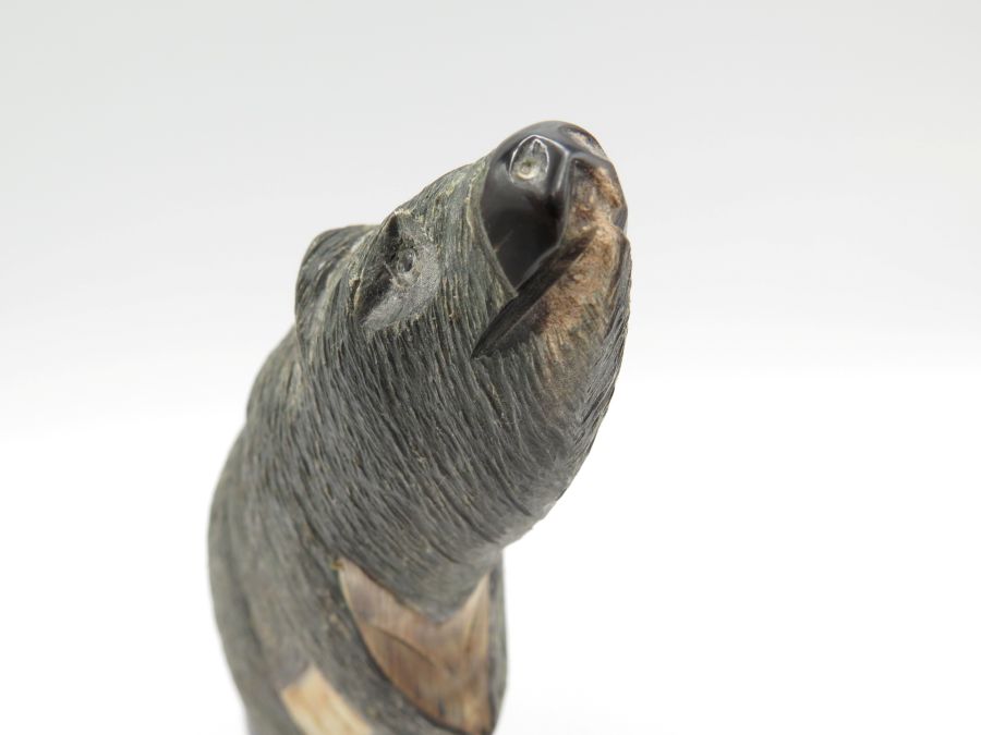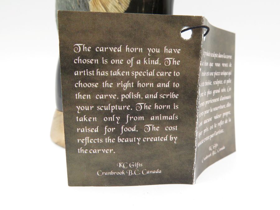 A one of a kind, hand carved bear, made from the horn of a buffalo. The horn is taken only from animals raised for food. The carving is 7 inches tall. Made in Canada.