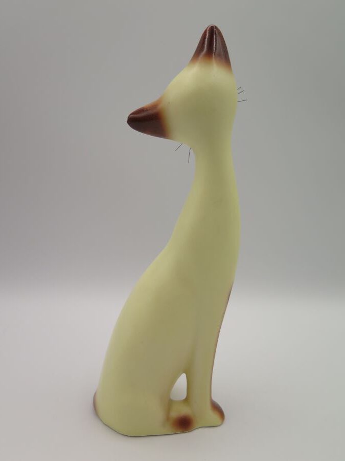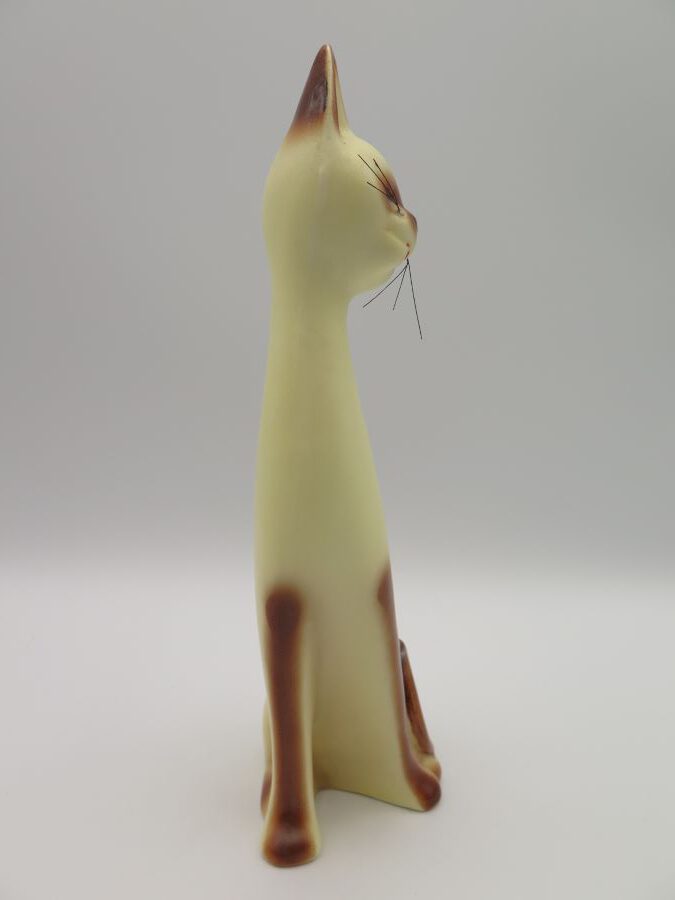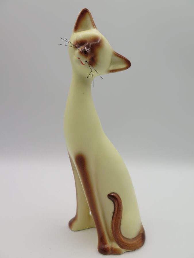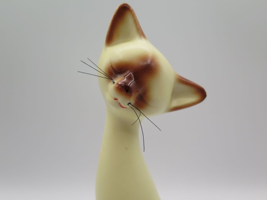 A ceramic siamese cat with whiskers, made in Japan by Giftcraft. The cat is 9 inches tall.