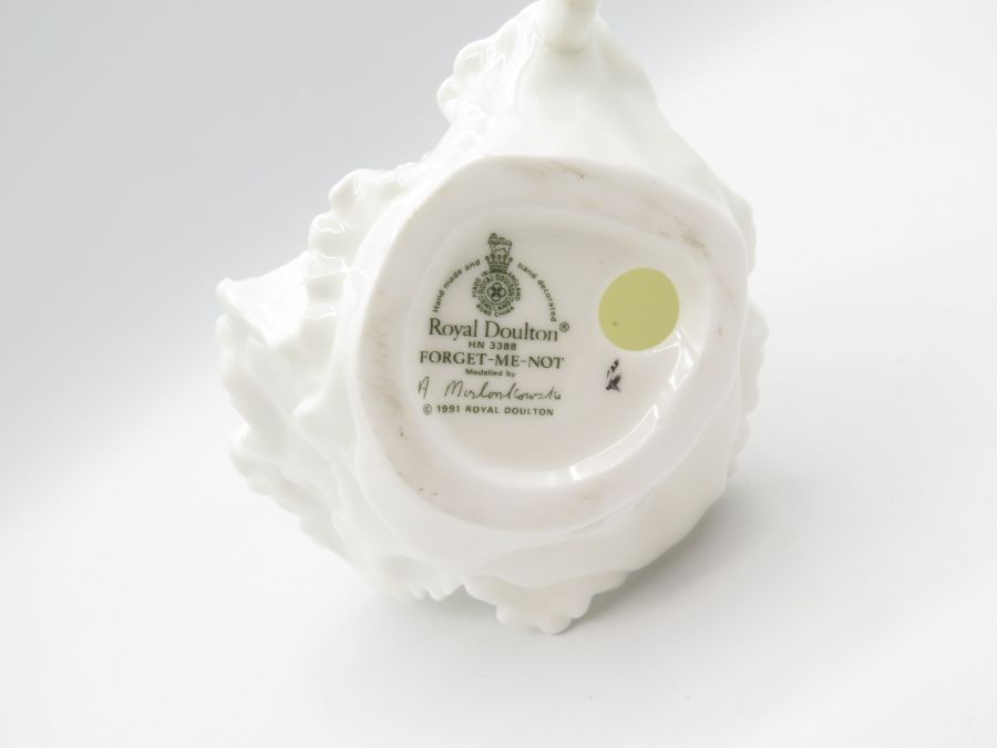 A figurine of a women called "Forget-me-Not", made in 1991 by Royal Doulton in England. It is 6 inches tall.