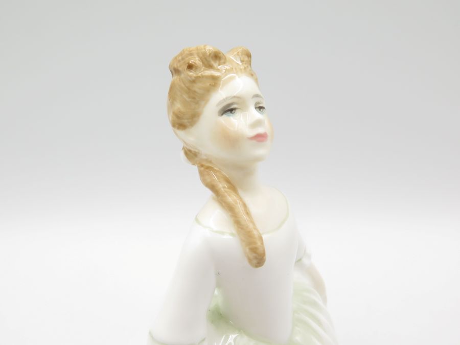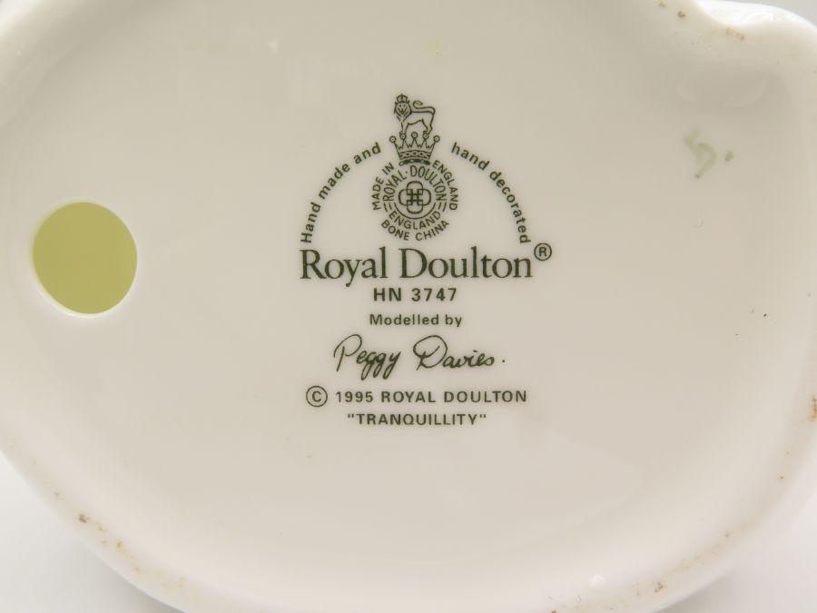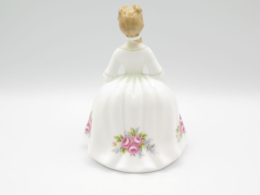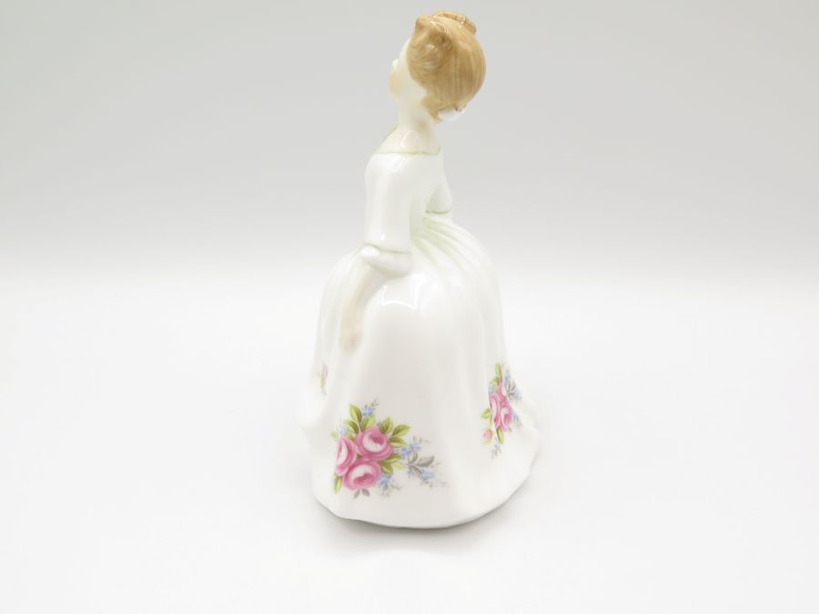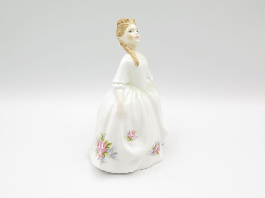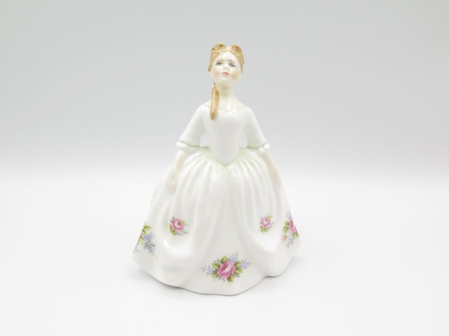 A figurine of a women in a dress that is decorated with roses called "Tranquillity". It was made in 1995 in England by Royal Doulton and it is 6 inches tall.