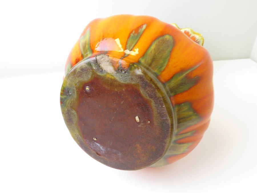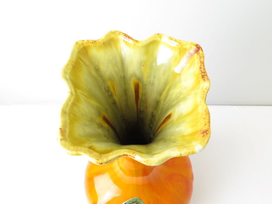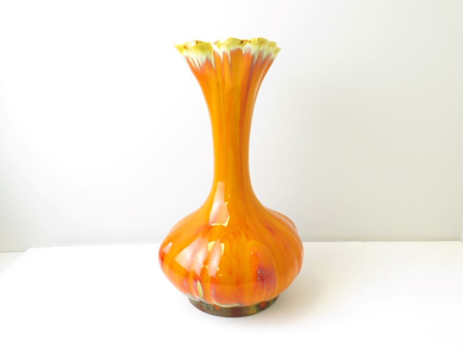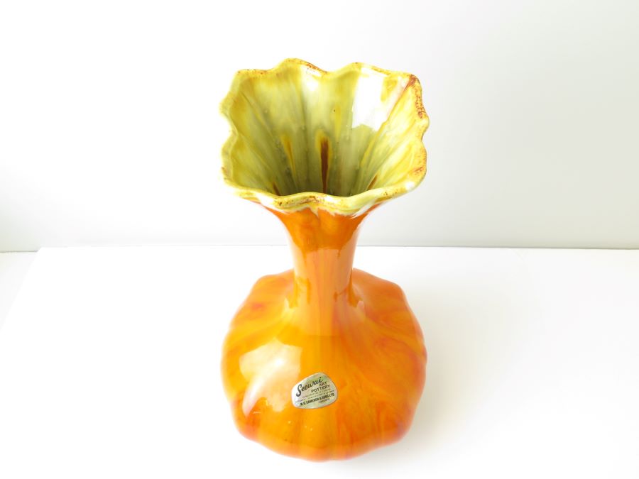 A large ceramic vase made in Canada by Seewai art pottery. The vase is 12 1/2 inches tall. There is a 1/2 inch chip in the glaze on the bottom.