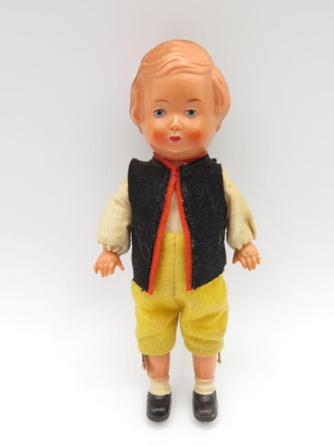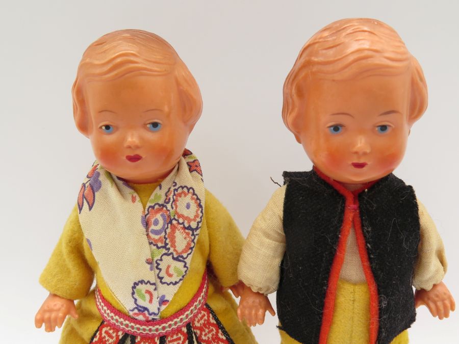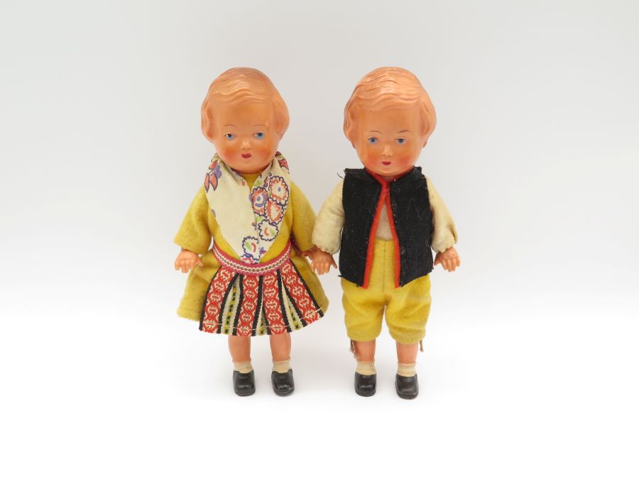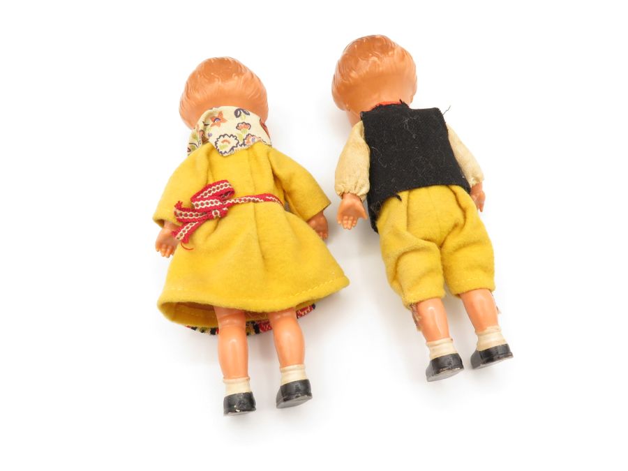 Two plastic dolls dressed in European clothes made from fabric. The dolls have moveable legs and arms and they are 6 1/2 inches tall.