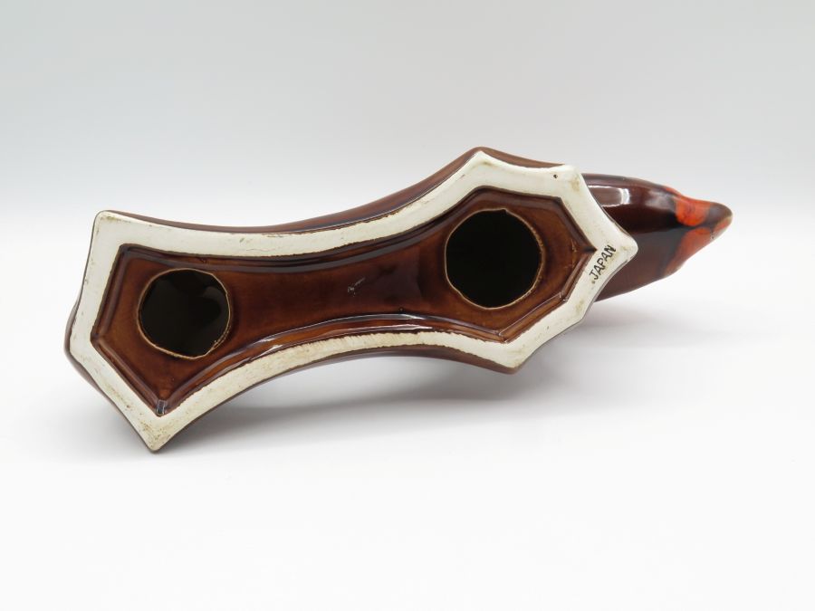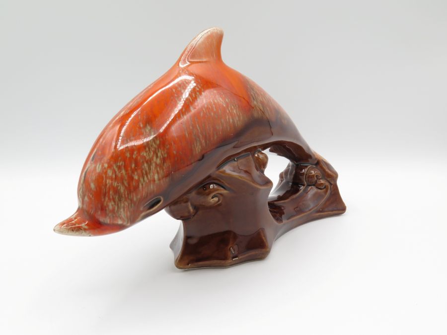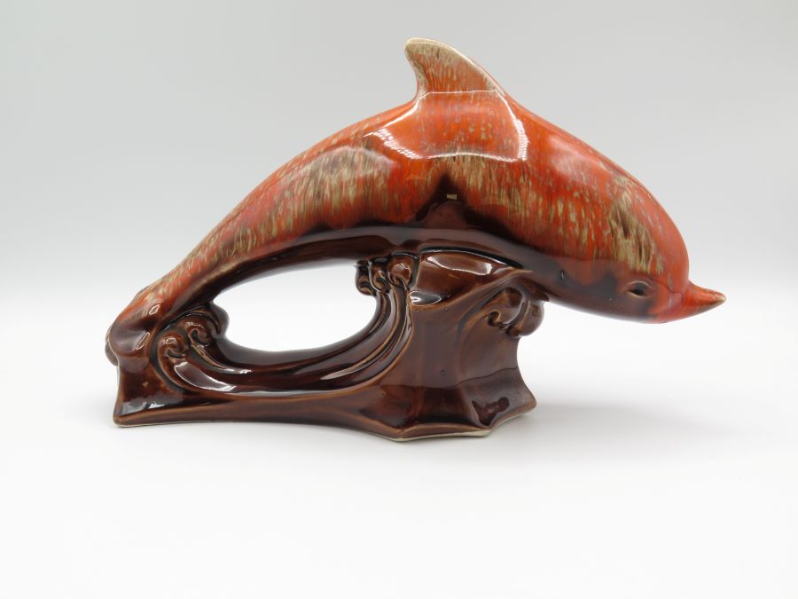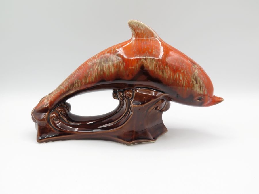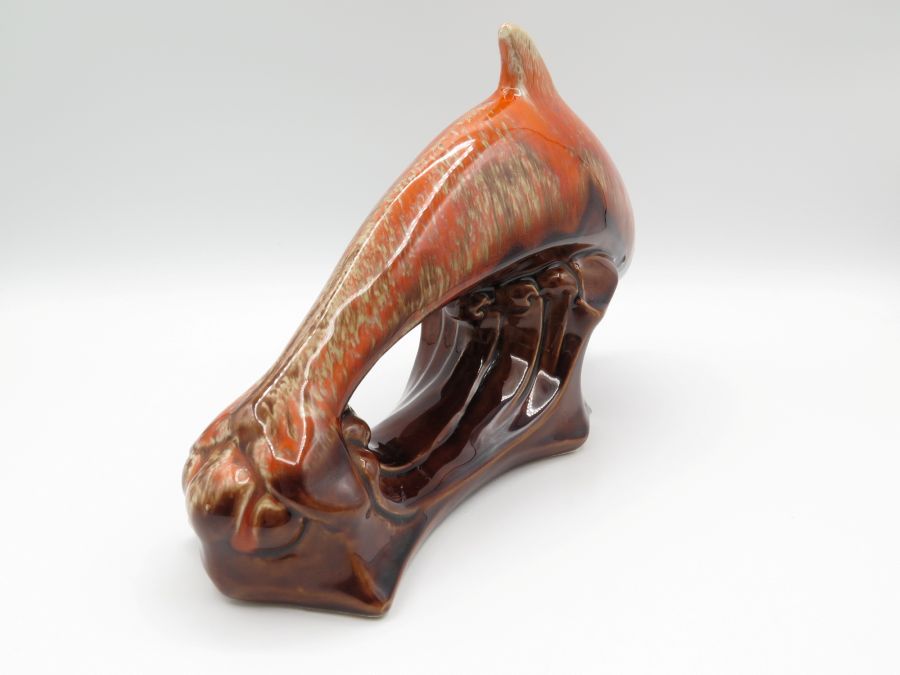 A ceramic dolphin figurine with a flow glaze from orange into brown. Made in Japan. It is 9 inches long and 6 inches high.