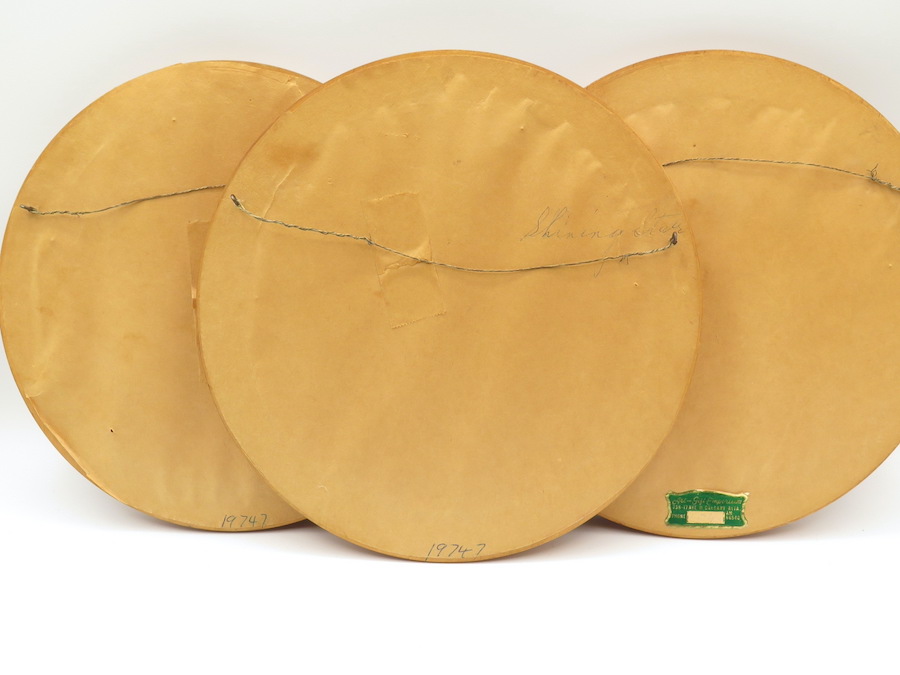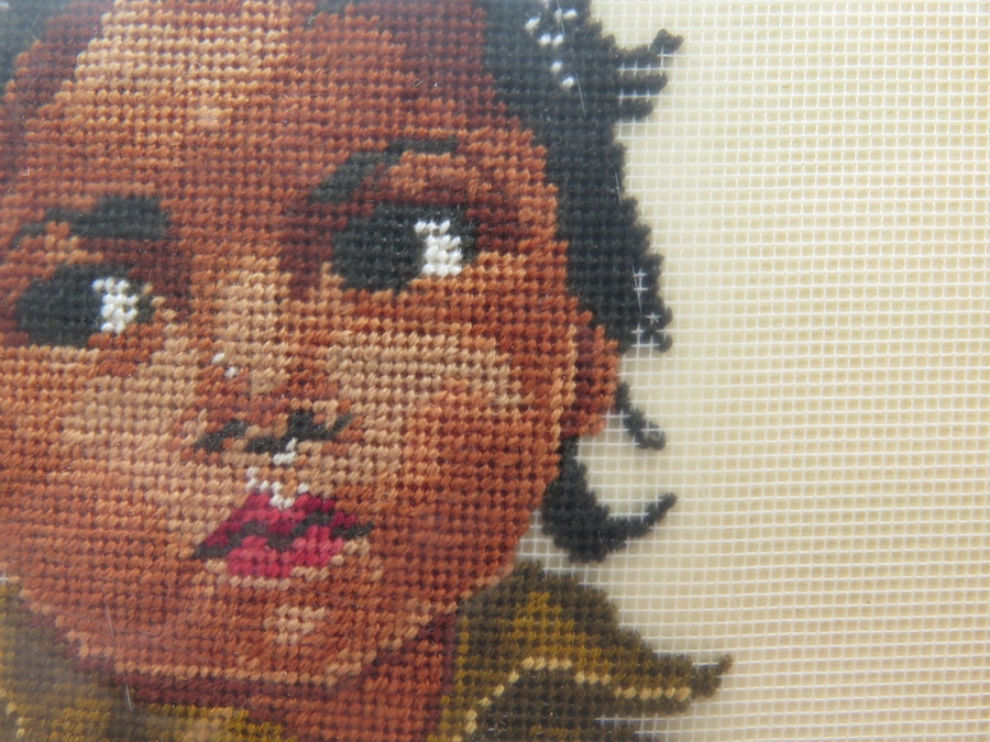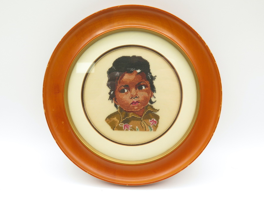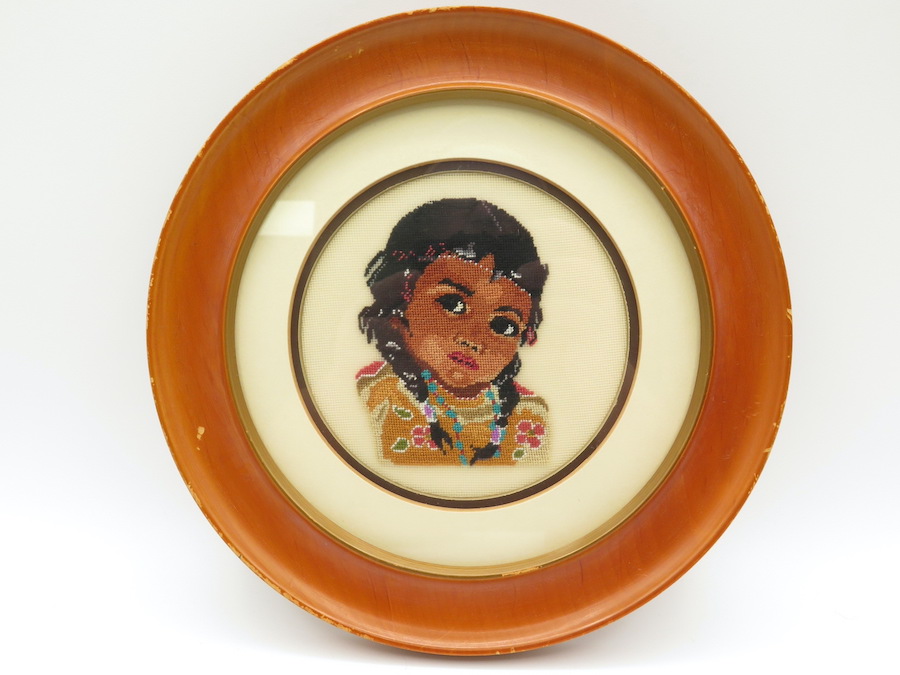 3 petit point pictures of native American children. Framed in round wood frames they measure 8 1/4 inches across.