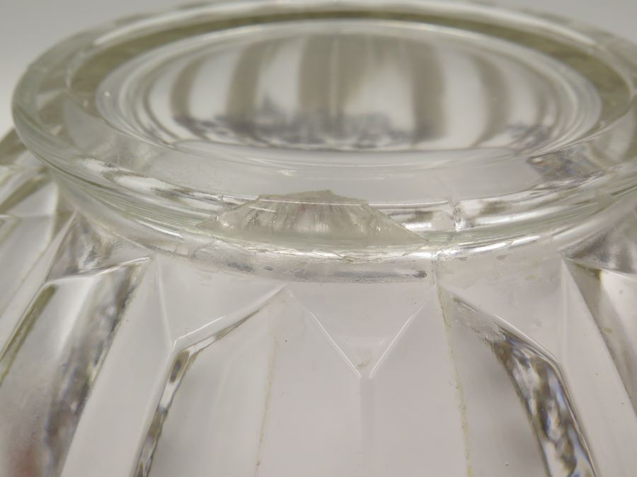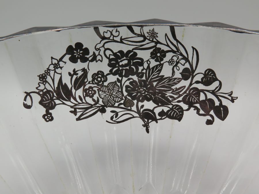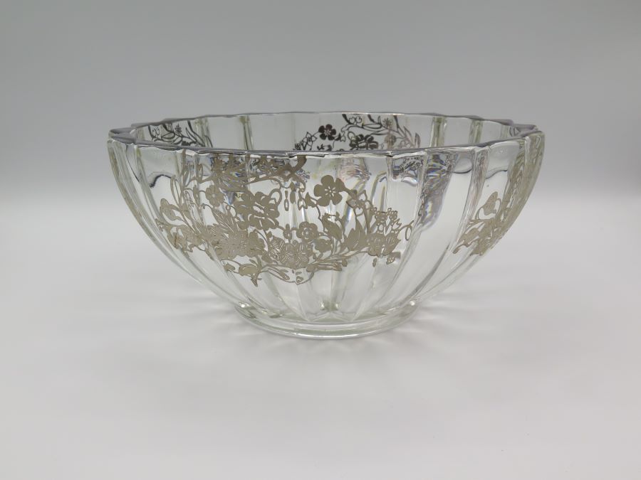 A thick glass bowl with ridges on the outside and decorated with silver overlay. It is 8 1/2 inches wide and 4 inches tall. There is an impact crack on the bottom edge.