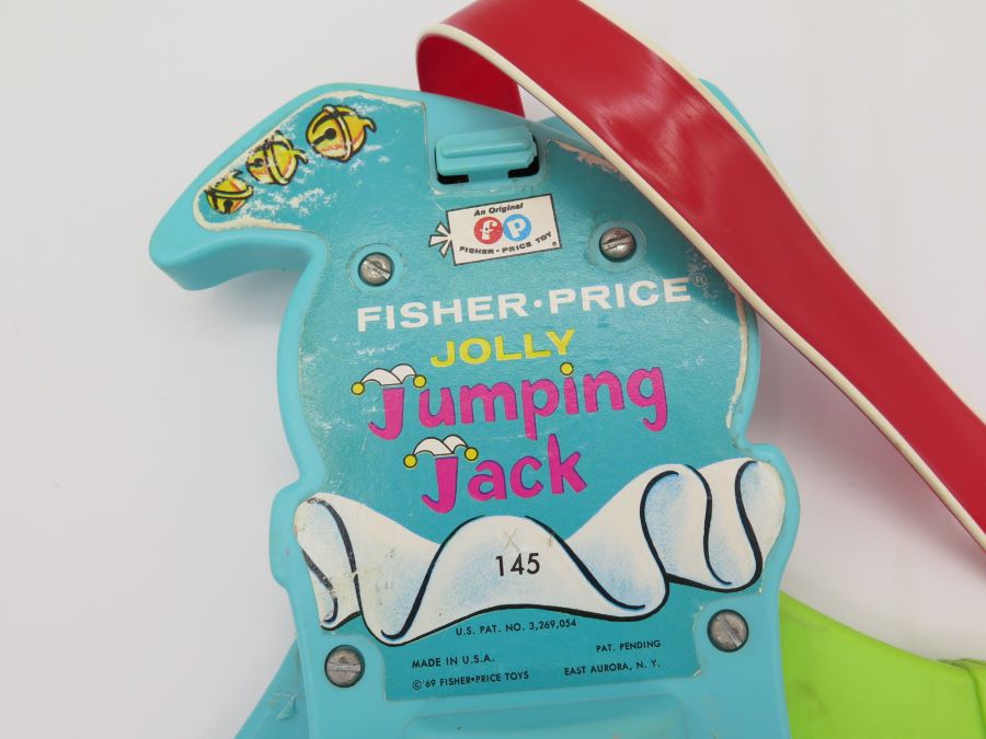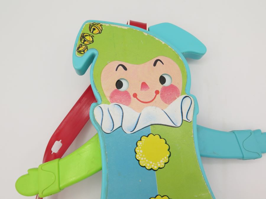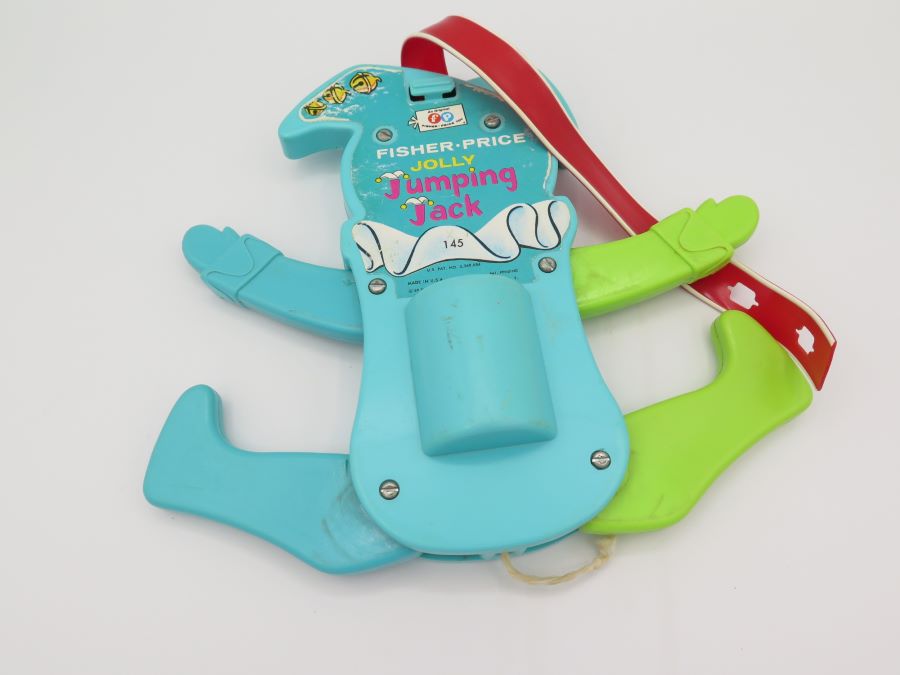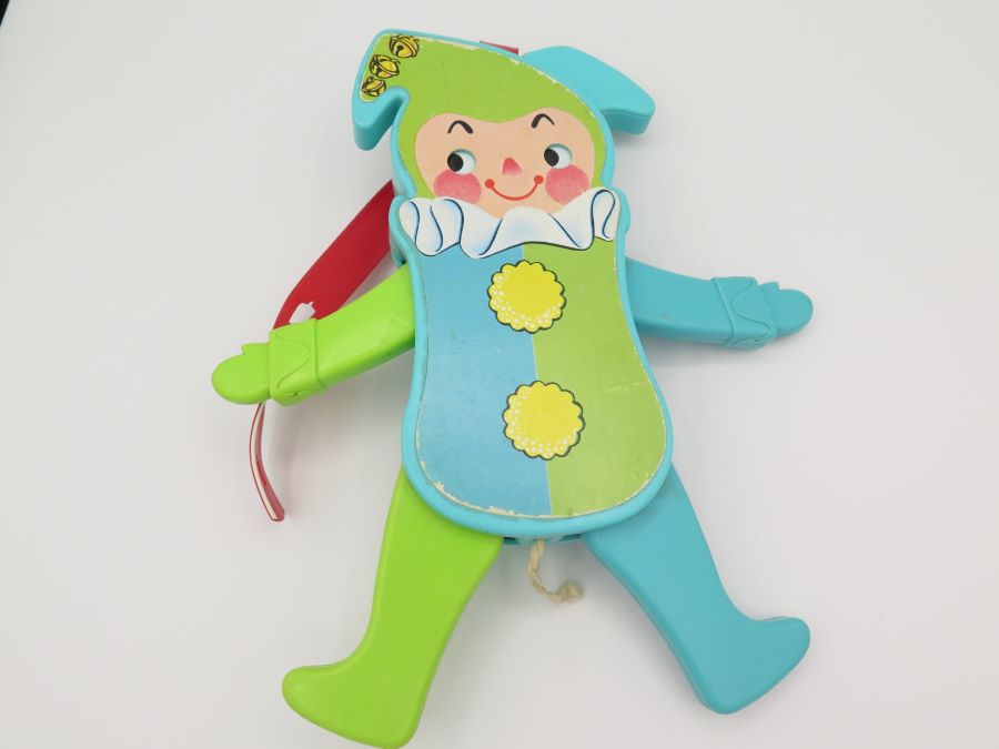 Jolly Jumping Jack made by Fisher Price in 1969, #145. The arms, legs and eyes move when the string is pulled. It also makes a squeak noise. The string is not original.