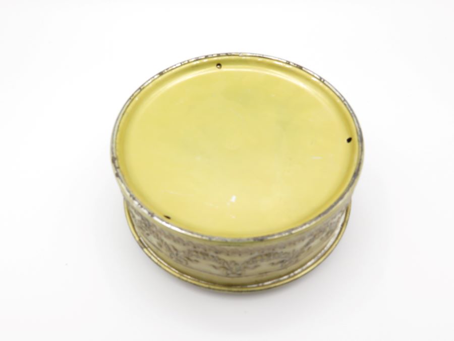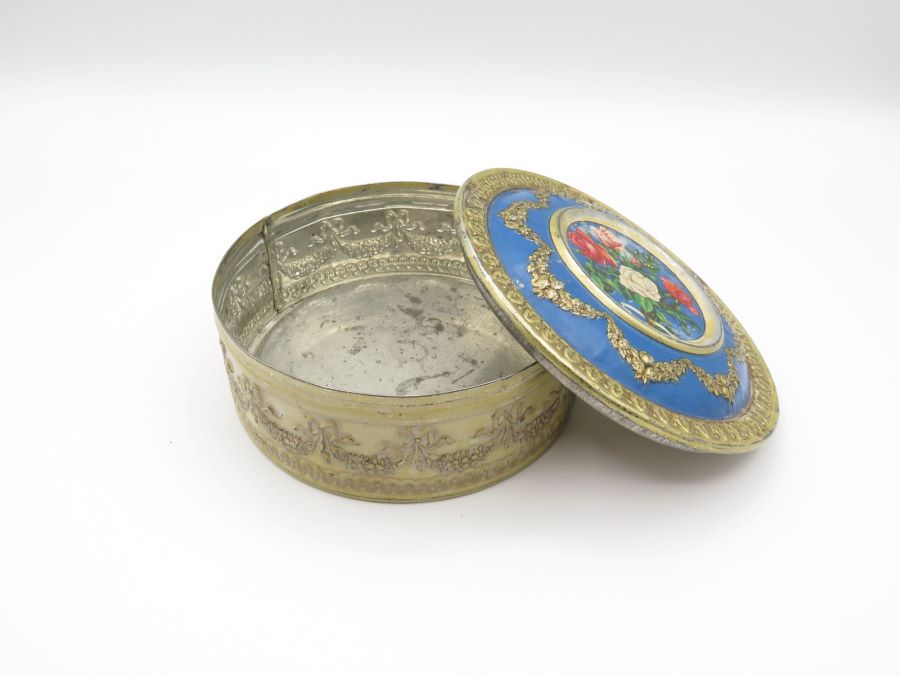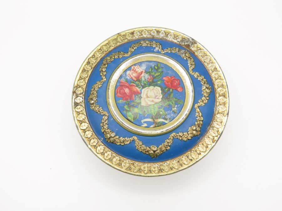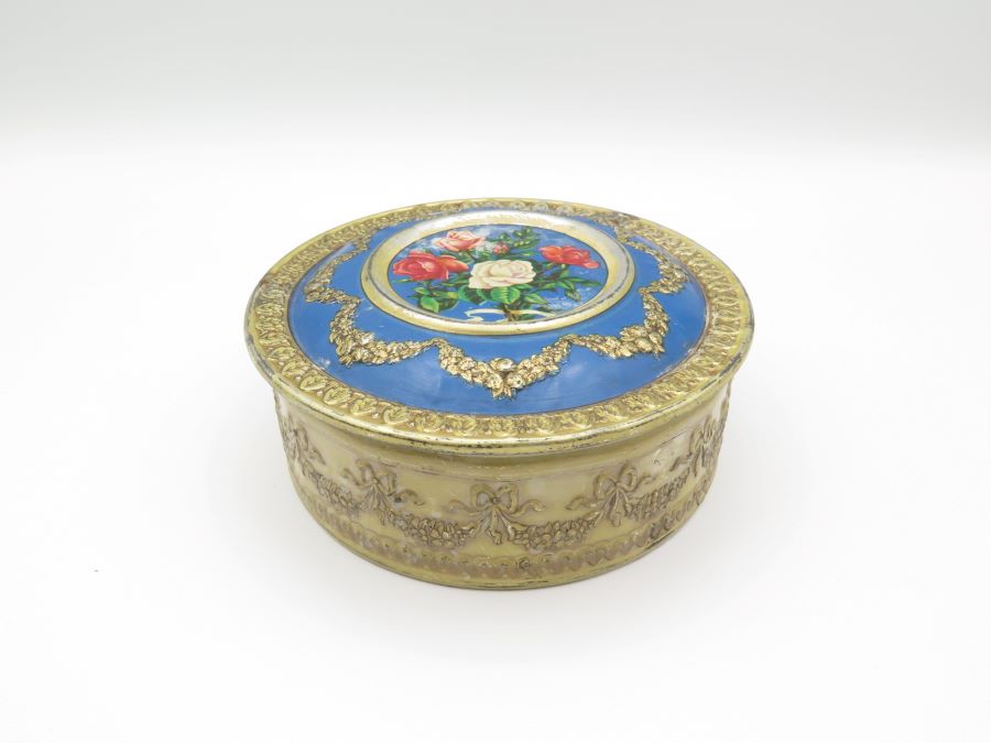 A metal tin marked made in England embossed with designs on the sides and lid. The lid is made of two layers of tin and decorated with roses. There are three small holes in the bottom of the container. The tin is 5 inches wide and 2 1/4 inches tall.