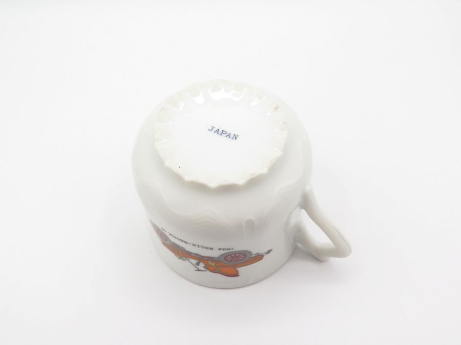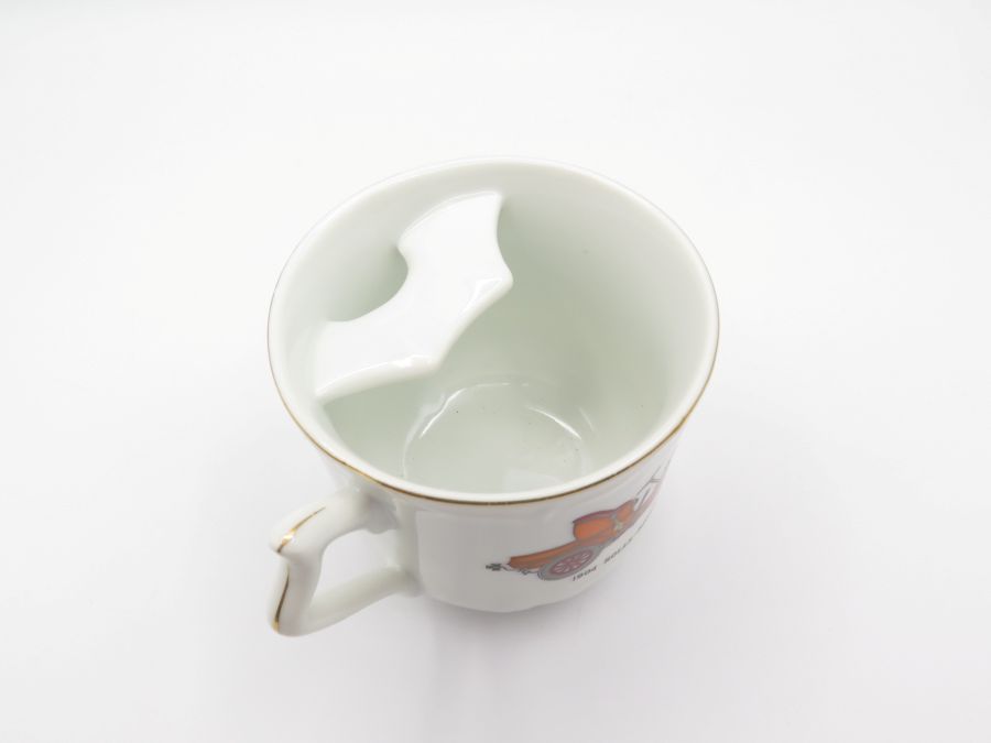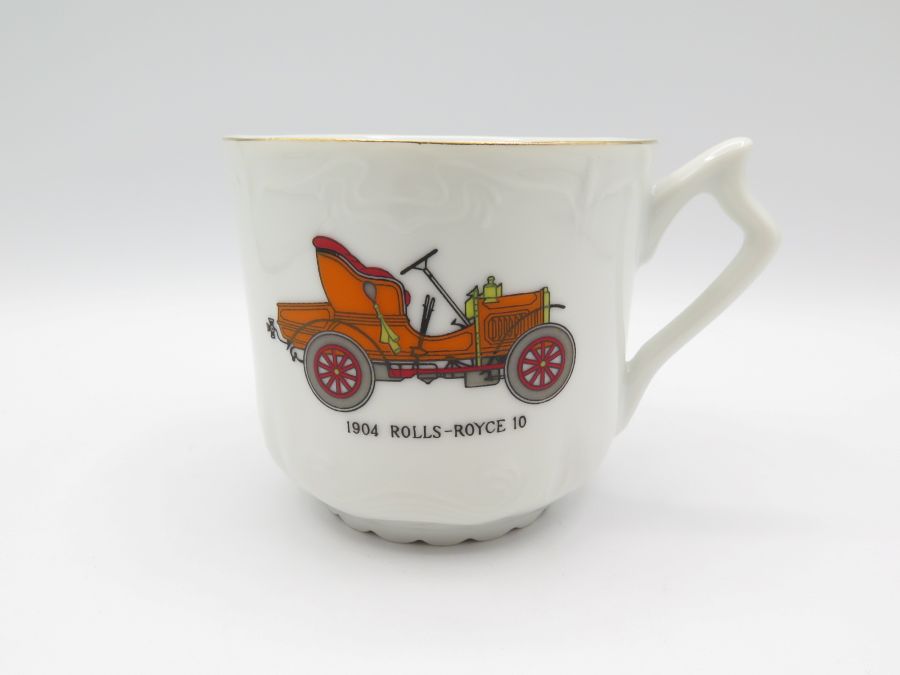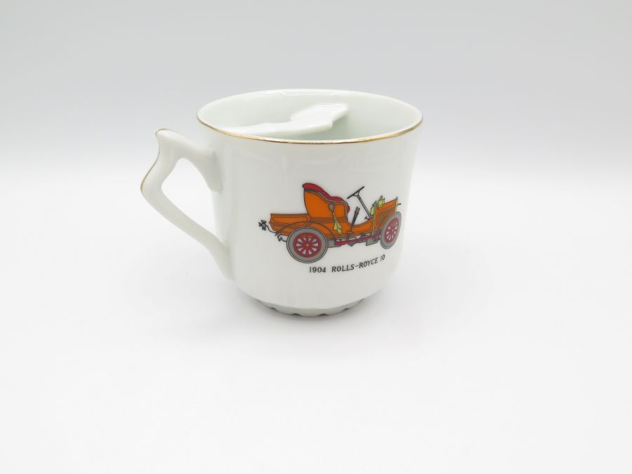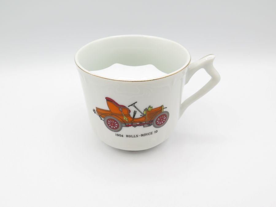 A ceramic moustache mug with gold trim and a 1904 Rolls Royce on each side. It is made in Japan and is 3 1/4 inches tall.