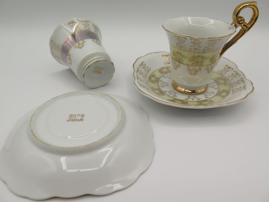 Two ceramic teacups with matching saucers. Made in Japan. One has blue stripe, the other has yellow, both are trimmed with gold. The cups are 3 1/4 inches tall to the top of the handle and the saucers are 4 1/2 inches across.