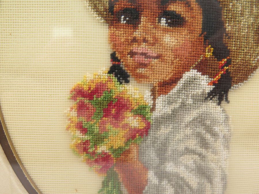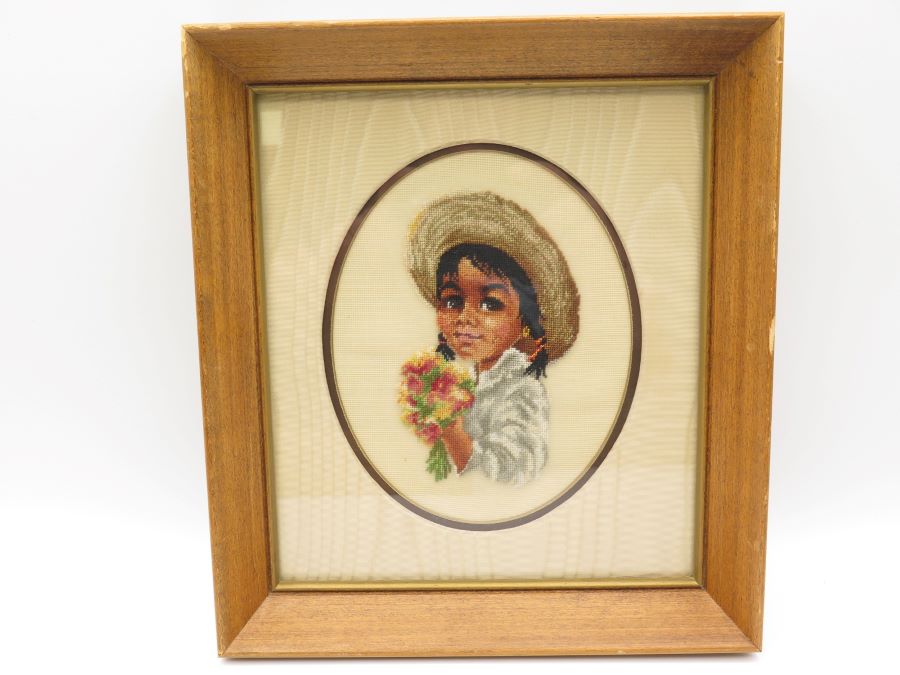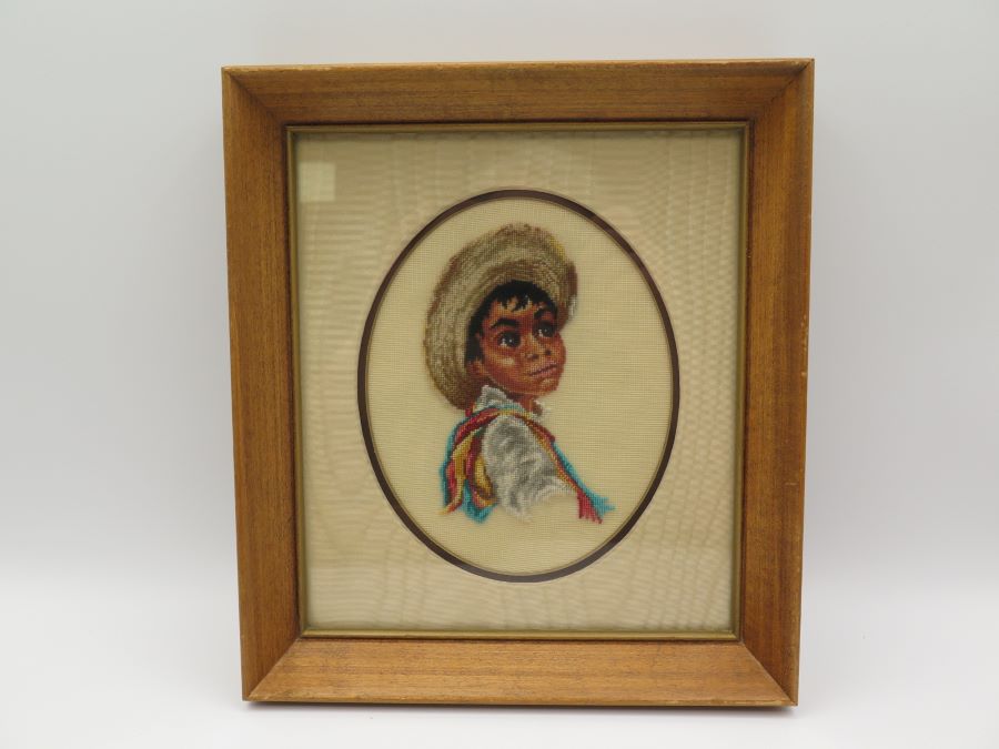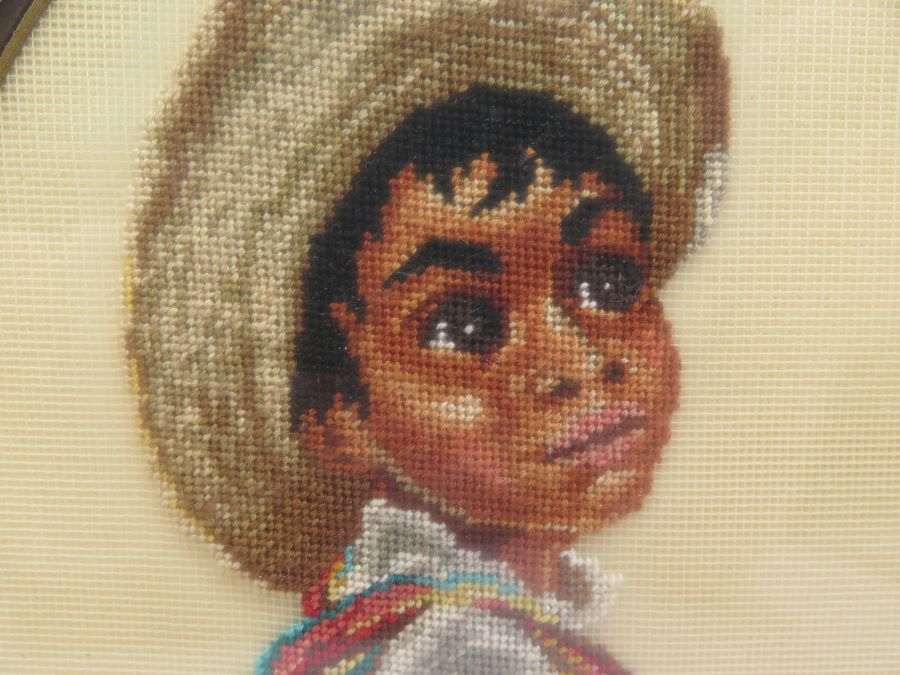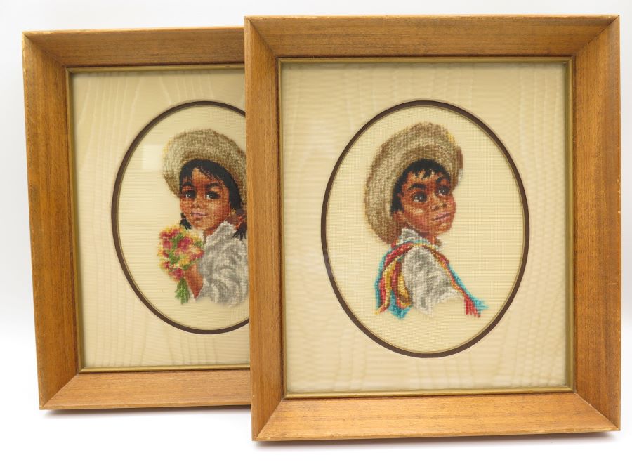 Two framed petit point pictures, one a boy the other a girl. Measured frame size is 9 by 8 inches.