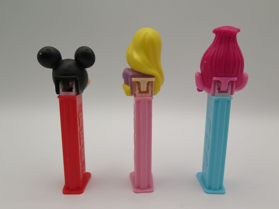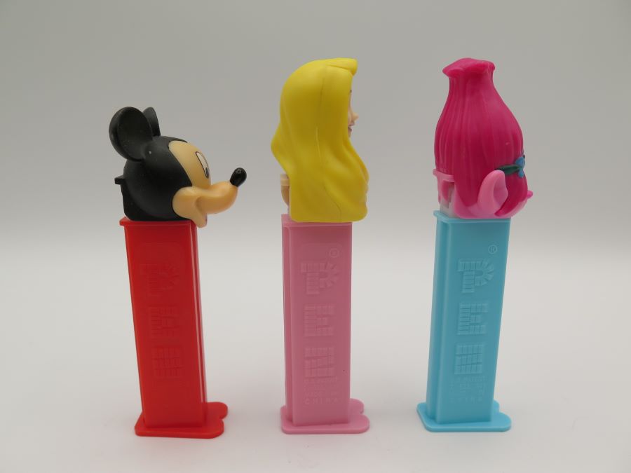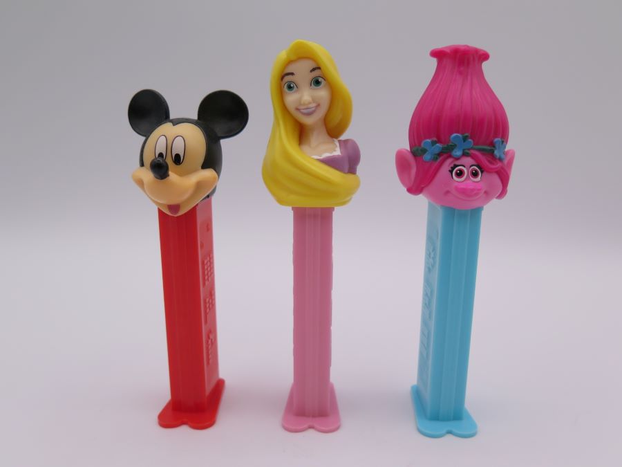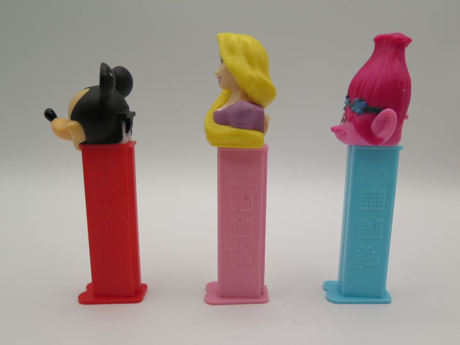 Pez dispensers depicting the the characters Mickey Mouse, Poppy and Rapunzel. All are made in China.