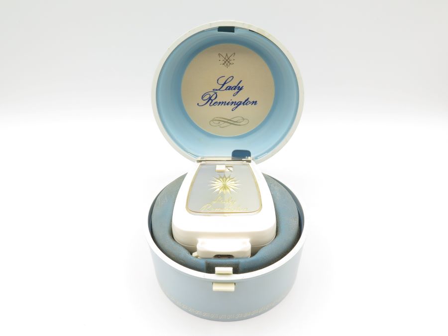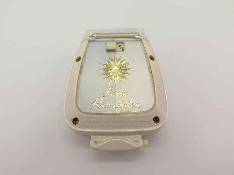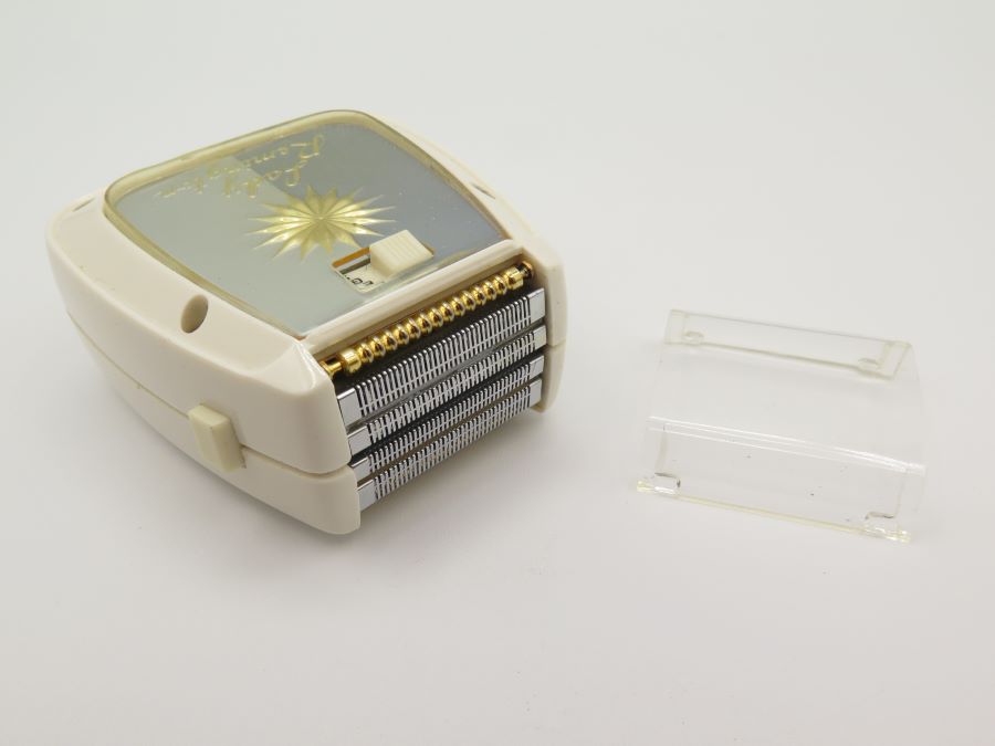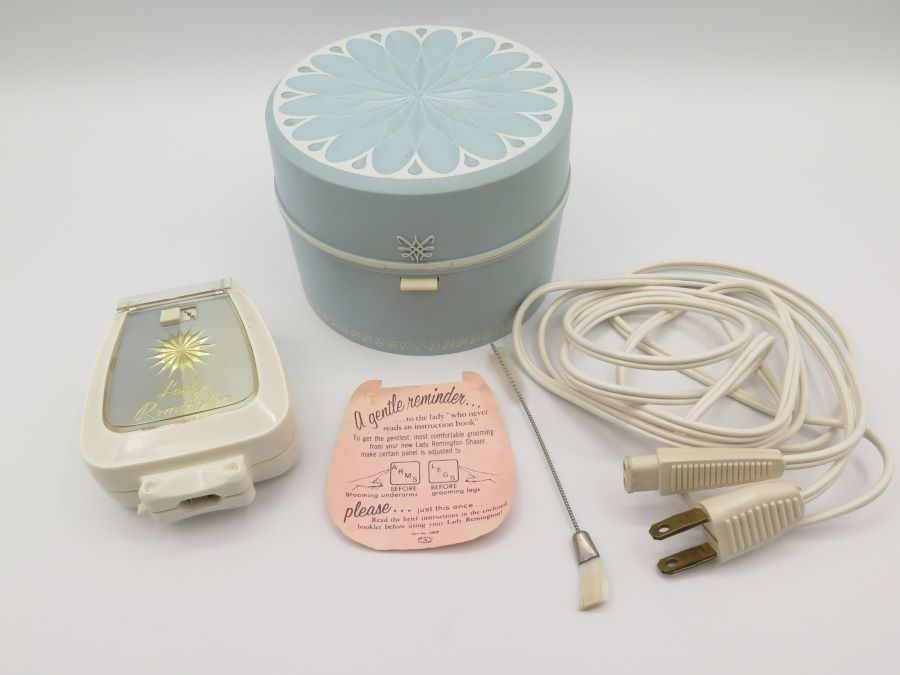 A vintage women's electric shaver. It comes with original box, cord, cleaning brush and instruction reminder. The shaver runs when tested.