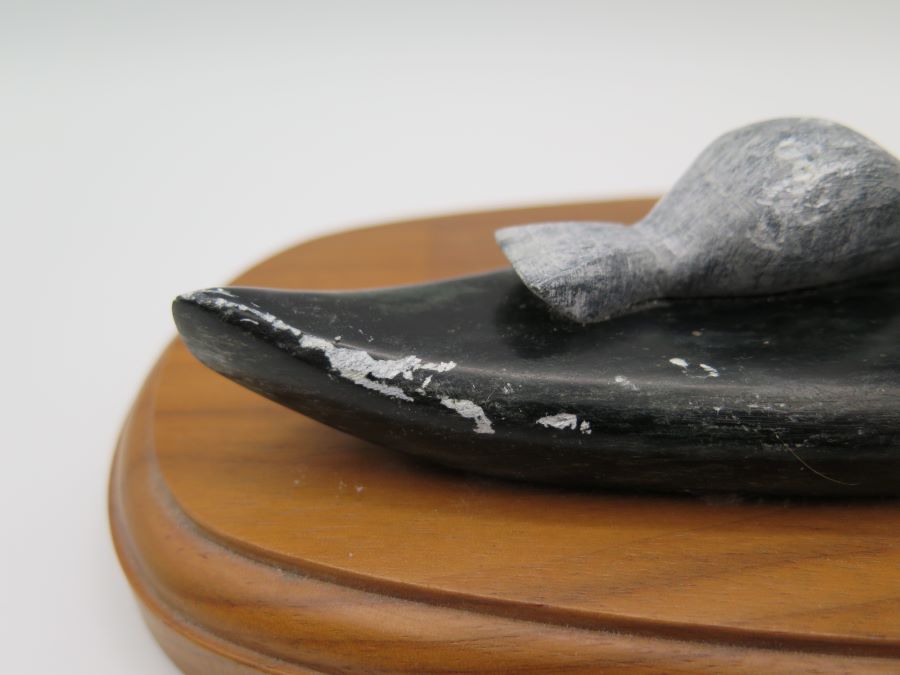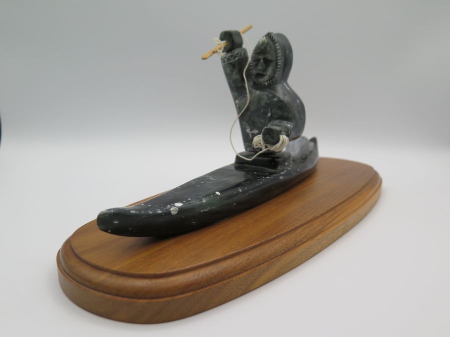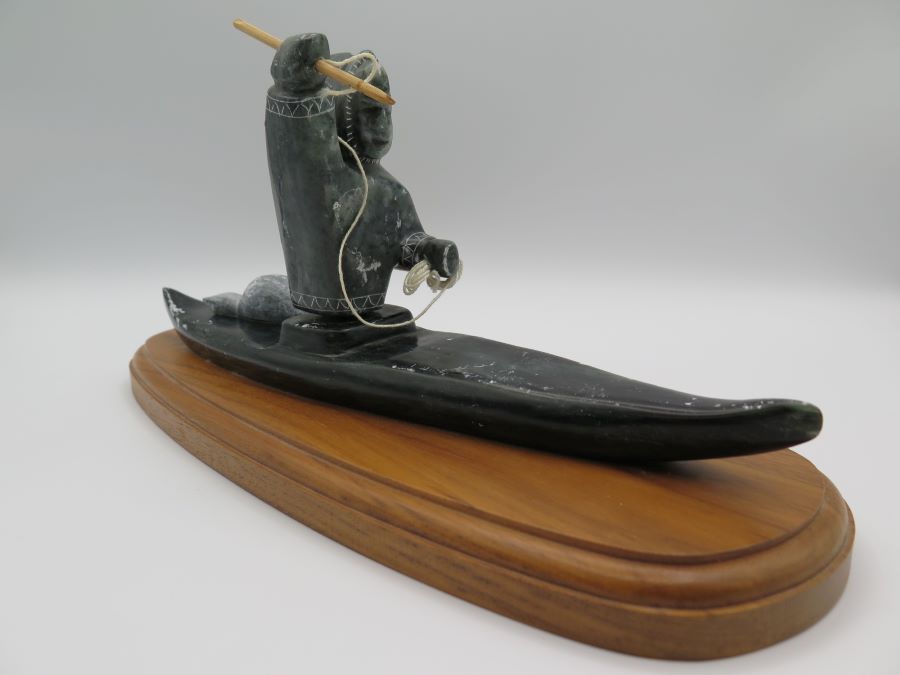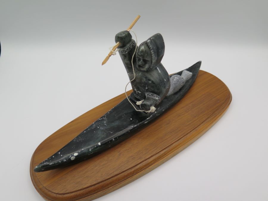 A soapstone carving of a seal hunter in his kayak. The carving is 11 inches long and is mounted on a piece of wood.