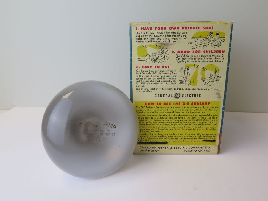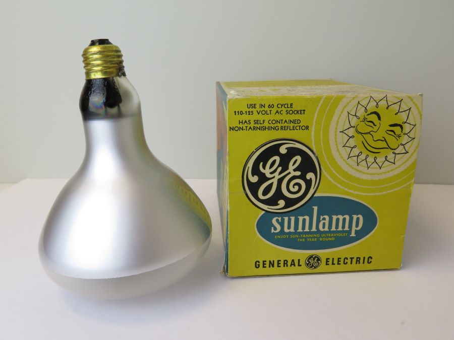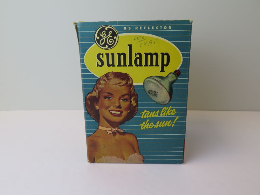 A General Electric reflector sunlamp in it's original box. The lamp works, note, there is a very small piece of material loose in the bulb.