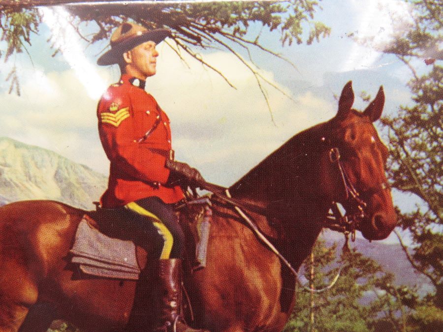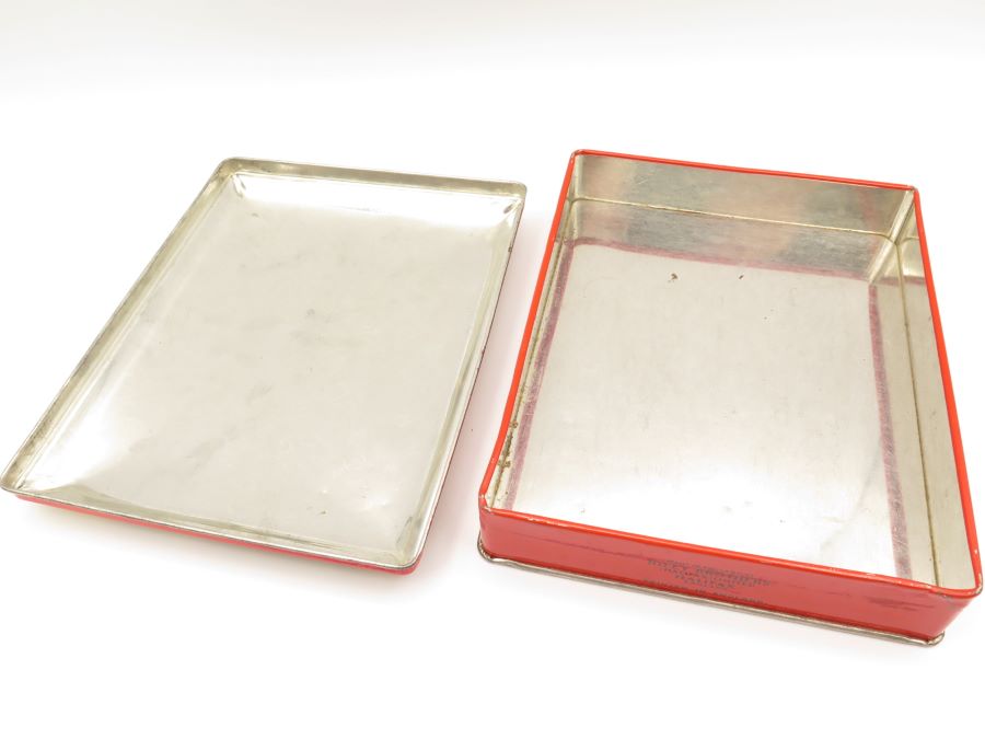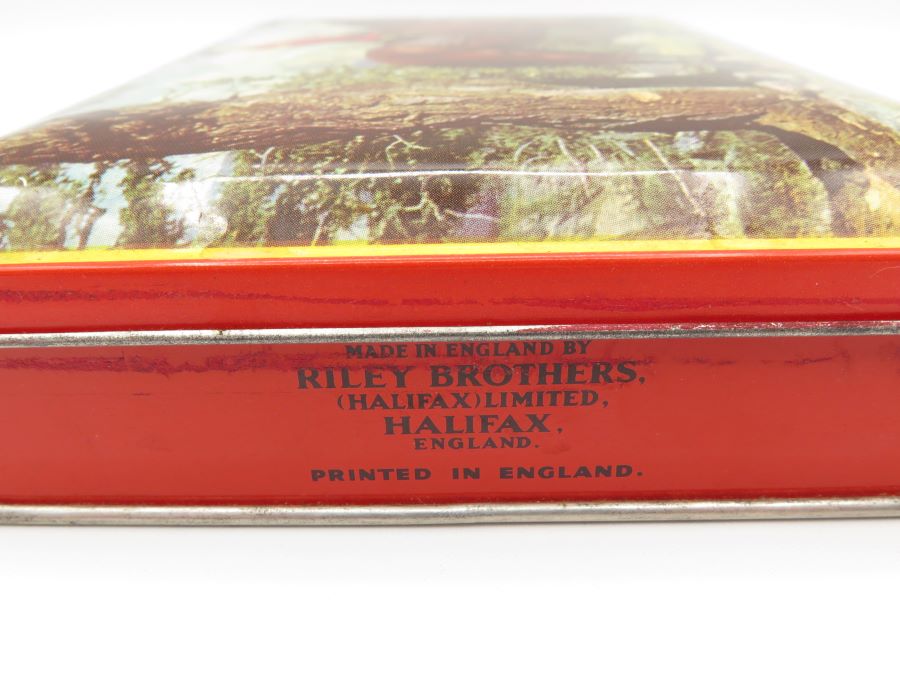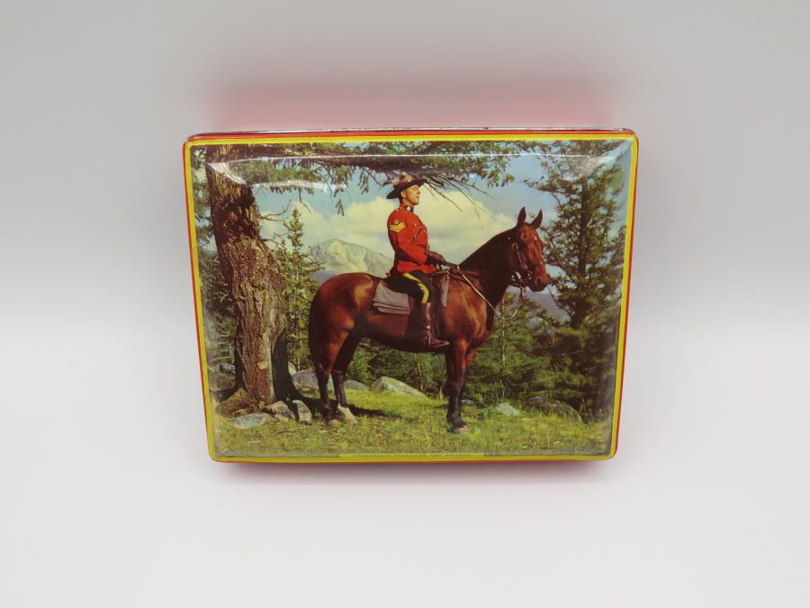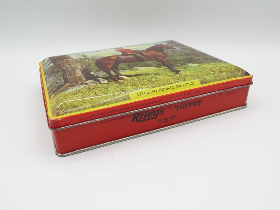 A tin made in England for Riley Brothers Toffee. The tin features a picture of a Canadian Mountie on the lid. It is 7 x 5 x 1 1/2 inches in size.