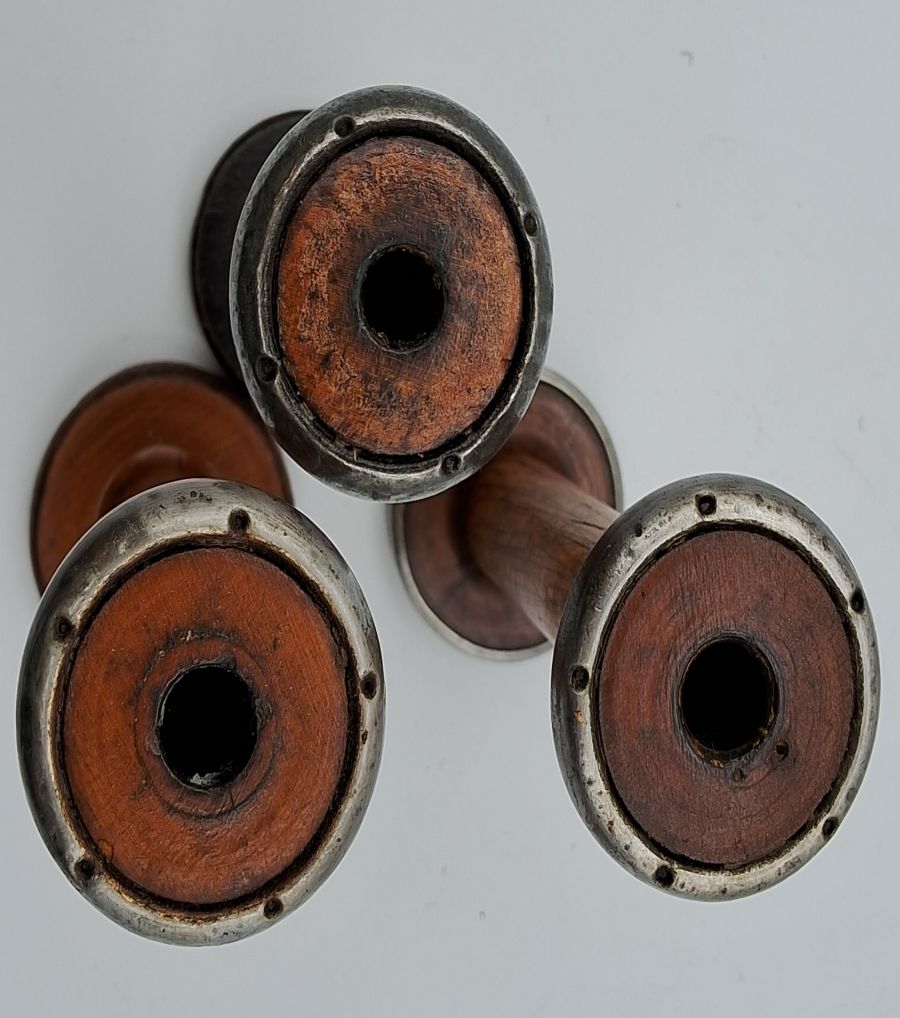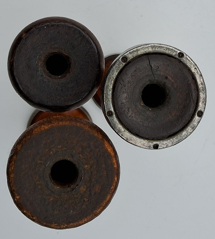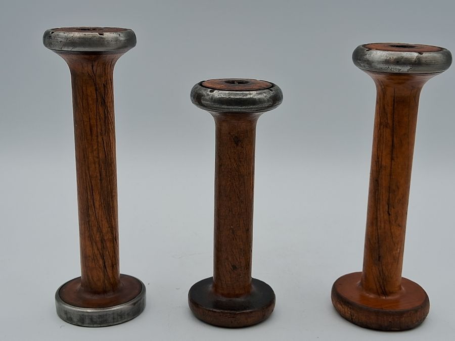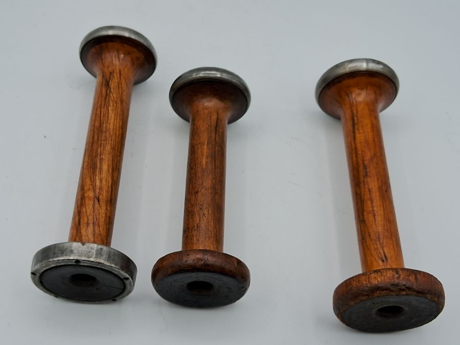 Set of three authentic antique draft wool spools (bobbins) with natural aged patina, perfect for vintage décor or collectors.